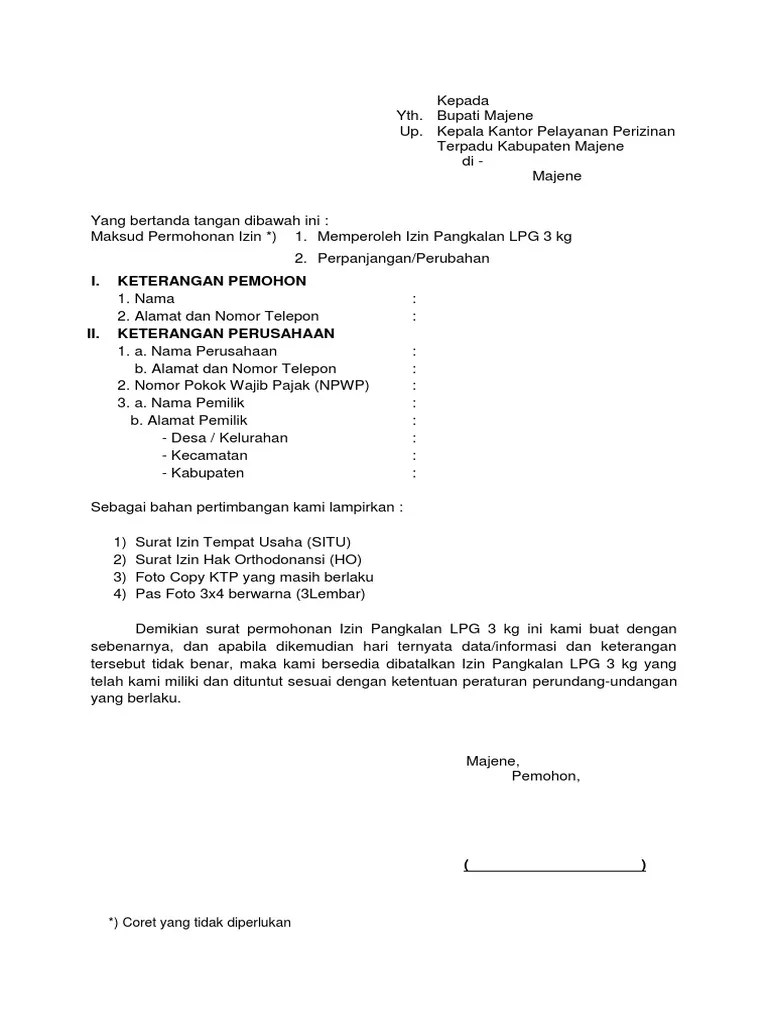 3.melampirkan surat keterangan izin dan rekomendasi mendirikan pangkalan lpg 3 kg dari kelurahan setempat. Lpg tabung 3 kilogram di titik serah sub penyalur/pangkalan di kabupaten cilacap. Mempunyai siup (surat izin usaha perdagangan), tdp (tanda daftar perusahaan), dan surat izin . Surat penunjukan dari agen lpg 3 kg disertai surat keterangan bukti kepemilikan tabung yang sah dari agen . Anda dapat dengan gampang menjumpai berbagai gerai usaha yang menjual gas 3 kg elpiji pertamina baik dari warung, toko, bengkel, rumah makan, dll. Surat permohonan izin pangkalan lpg 3 kg contoh seputar surat. Cara pengajuan permohonan jadi pangkalan gas /lpg 3kg bersubsidi (permohon jadi agen gas elpiji) cara yang . Izin pangkalan gas lpg 3 kg. Badan usaha mengajukan permohonan izin usaha. Anda sedang mencari informasi mengenai . Menyiapkan fotocopy ktp, foto berwarna . Mengisi formulir permohonan dengan dilampiri : Dan tata niaga liquefied petroleum gas (lpg) tabung 3 kilogram.